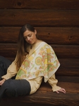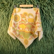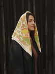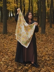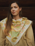 Почерк пані Оксани класичний косівський, схожий до прабабусиного, але кольори - яскравий жовтий та зелений - робили її кераміку особливо сонячною та доброю. Вона любила зображувати наївні сюжети, особливо анімалістичні з овечками.Їх ми й вирішили перенести з тарелів на хустку та створити дизайн за почерком майстрині.Хустка входить до нашої нової колекції, присвяченої сучасним майстриням косівської кераміки та їхньому творчому шляху, на якому вони зуміли стати мисткинями про яких має знати увесь світ. Але спершу - ви!