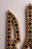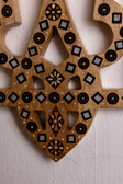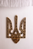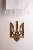 Герб інкрустована перламутром, бісером і самою ж деревиною. Зроблений з дерева , руками майстра з Річки, який займається цим ремеслом у третьому поколіні.